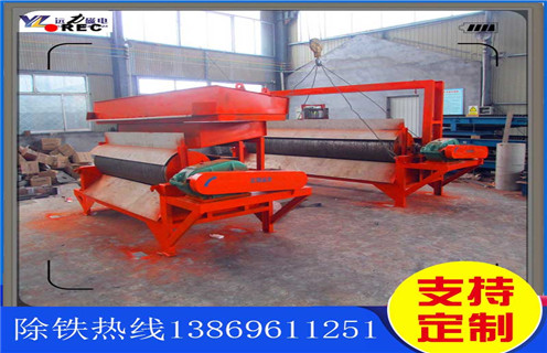 4、含有铁磁性杂质的物料通过受料斗经电磁振动给料机均匀的下到第一道输送皮带上,当物料通过强磁辊时,铁磁性物质被磁力吸引被吸附到强磁辊上,随着皮带的转动使其从磁场脱离并落入收集斗中。其它物料和没有选净的铁磁性物质随溜槽进入下一级磁选皮带进行分选,原理同上。最后选出合格的产品。